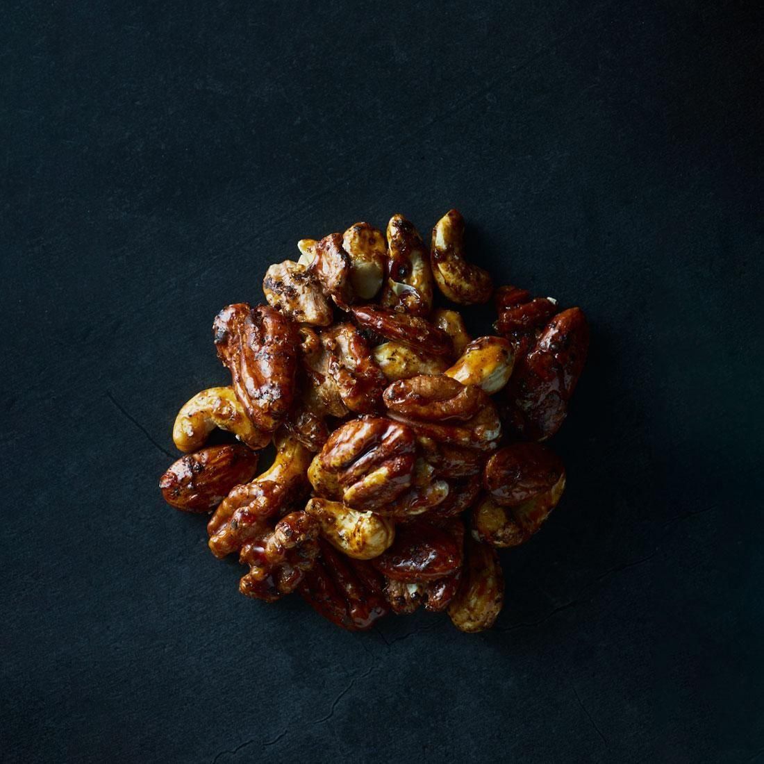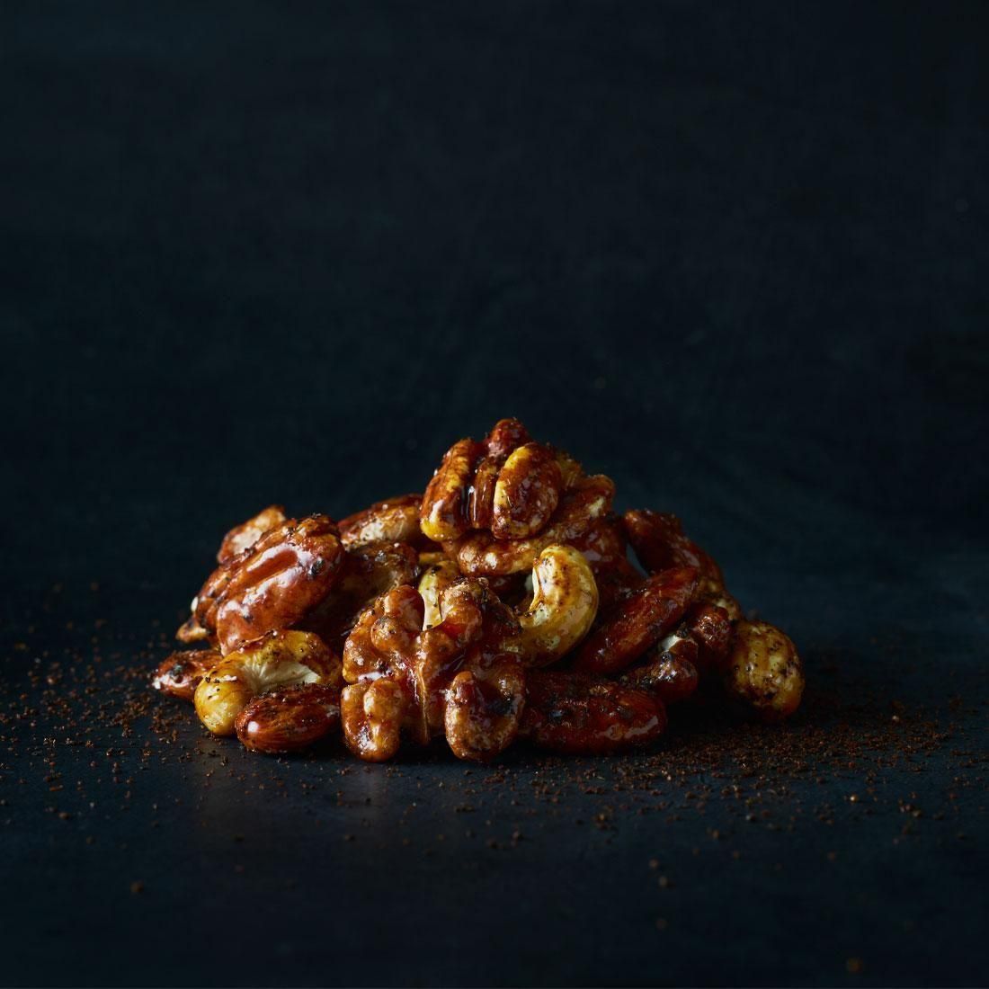 材料をから煎りし、唐辛子や山椒の色が隠れるまで丁寧に揉み込む事によって独特の黒い七味になります。ピリッとした唐辛子の辛さと、山椒の豊かな香りがオーガニックナッツを引き立たせます。