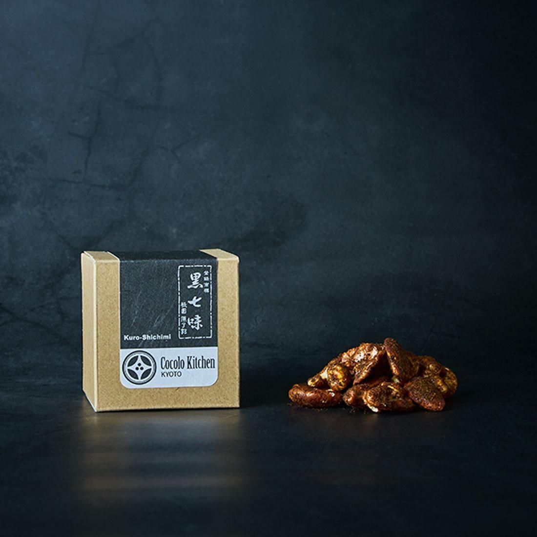 材料をから煎りし、唐辛子や山椒の色が隠れるまで丁寧に揉み込む事によって独特の黒い七味になります。ピリッとした唐辛子の辛さと、山椒の豊かな香りがオーガニックナッツを引き立たせます。