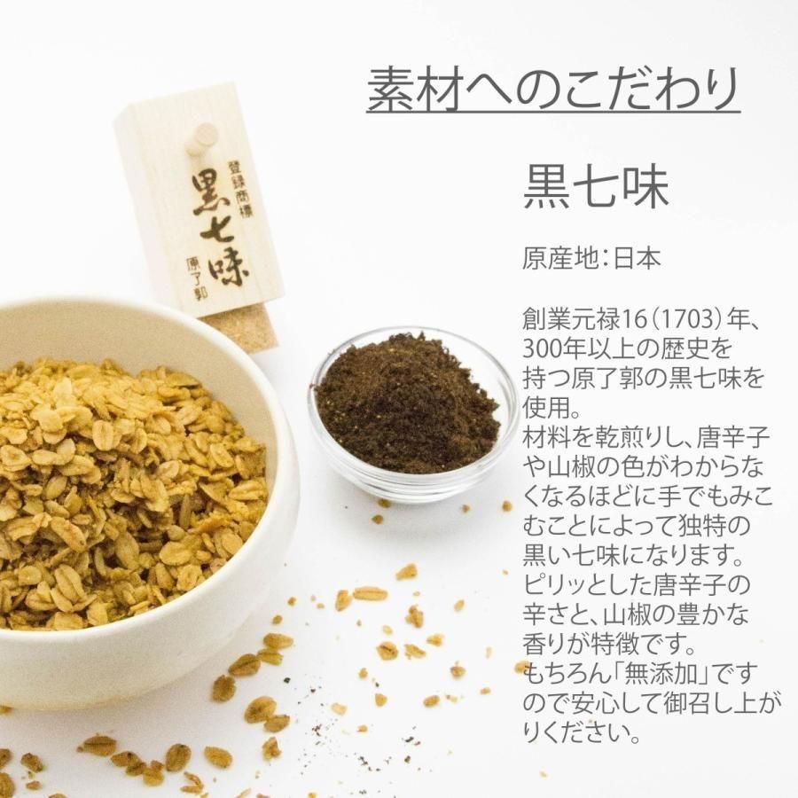 創業元禄16(1703)年、300年以上の歴史を持つ原了郭の黒七味を使用。材料を乾煎りし、唐辛子や山椒の色がわからなくなるほどに手でもみこむことによって独特の黒い七味になります。ピリッとした唐辛子の辛さと、山椒の豊かな香りが特徴です。
